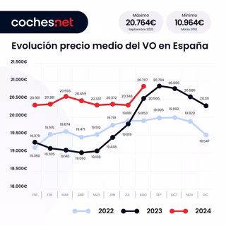 A pesar de esta ralentización de mercado en general, el precio se acerca mucho al récord absoluto, que se registró en septiembre de 2023, cuando se alcanzaron los 20.764 euros. Así, se destaca el repunte de la factura media del vehículo seminuevo que se sitúa en los 42.520 euros, un 4,5% más que hace un año.