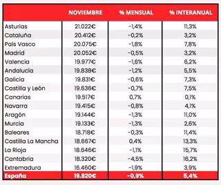 Tras Asturias, las siguientes comunidades autónomas con los precios más altos son Cataluña, con 20.412 euros (+3,2% interanual), País Vasco (20.075 euros; +7,8%), Madrid (20.052 euros; +3,2%) y Valencia (19.977 euros; +6,2%).