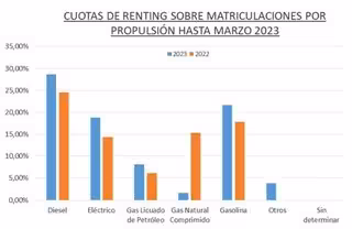 Por tipos de combustible, en el primer trimestre del año se matricularon en 'renting' 28.807 vehículos diésel, lo que representó el 39% del total, mientras que de gasolina se registraron 41.986, lo que supone una cuota del 56,8%.