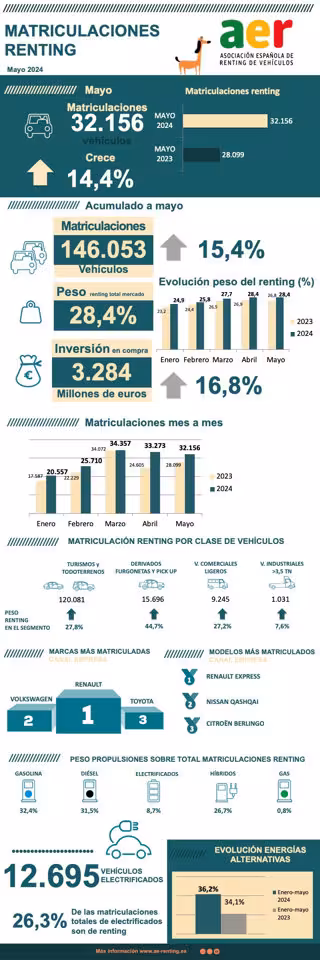 En mayo, se han matriculado en el sector del renting 32.156 automóviles, frente a los 28.099, que se registraron en mayo de 2023, es decir, se han incrementado un 14,44%. De su lado, el mercado total ha crecido un 6,56%, con 113.258 matriculaciones en el mes.