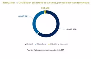 A cierre de 2019, en España circulaban 32 millones de vehículos, de los cuales 24,3 millones eran turismos. Los coches se dividen, según el tipo de motor, en diésel (14,9 millones de unidades), gasolina (8,8 millones de unidades) y otras motorizaciones (561.580 unidades). Este último grupo se compone casi en su totalidad por híbridos y eléctricos.