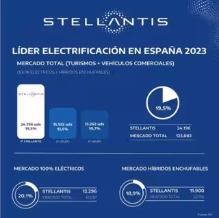 El grupo Stellantis matriculó en España 24.196 turismos y vehículos comerciales electrificados (100% eléctricos e híbridos enchufables) de sus marcas (Abarth, Alfa Romeo, Citron, DS Automobiles, Fiat, Jeep, Opel y Peugeot) durante 2023, lo que le permitió hacerse con una cuota de mercado nacional del 19,5%, según informó el consorcio este miércoles.