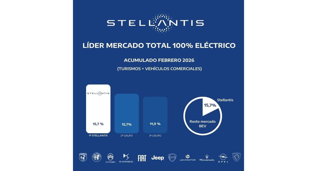Stellantis, con sus marcas Abarth, Alfa Romeo, Citroën, DS Automobiles, Fiat, Jeep, Lancia, Leapmotor, Maserati, Opel y Peugeot, lidera el mercado total 100% eléctrico (turismos + vehículos comerciales) en España en lo que va de año, con un total de 2.704 matriculaciones y una cuota de mercado del 15,7% en este periodo.