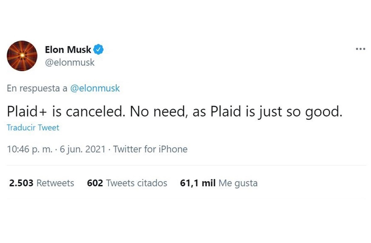 En su cuenta oficial de la red social Twitter, lugar habitual donde Musk suele hacer muchos comentarios a cerca de la empresa, el directivo aseguró que la variante Plaid + del Model S ha sido cancelada ya que, a su juicio, la versión Plaid es "tan buena" que "no es necesaria" otra superior.