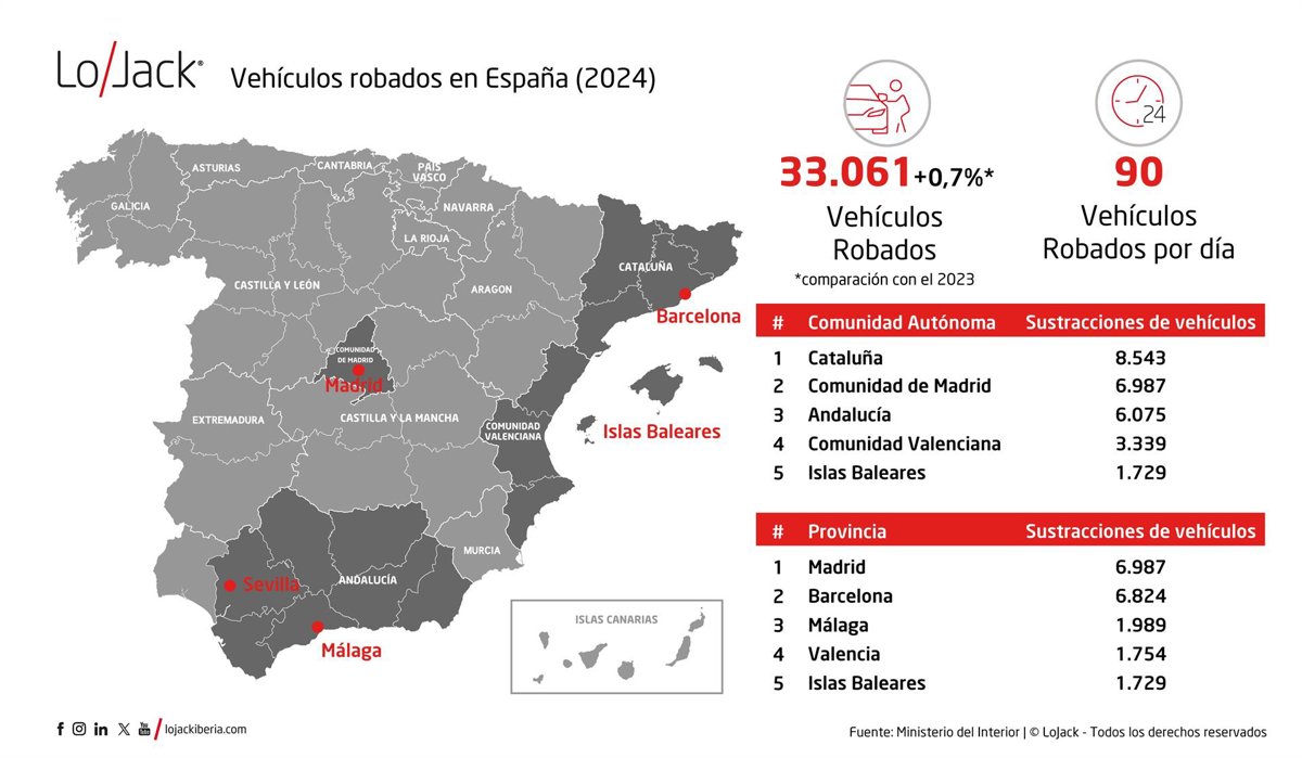 Un total de 33.061 vehículos se robaron en España en 2024, lo que representa un crecimiento del 0,7 % con respecto a 2023. - LOJACK