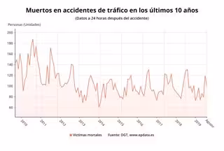En cuanto a agosto, se produjeron 97 accidentes mortales y hubo dos días (el 1 y el 12) en los que no se registraron siniestros mortales. Además, hubo 3 días en los que falleció una persona, cuando la media diaria de agosto de 2018 fue de 4. Este año ha bajado a 3.