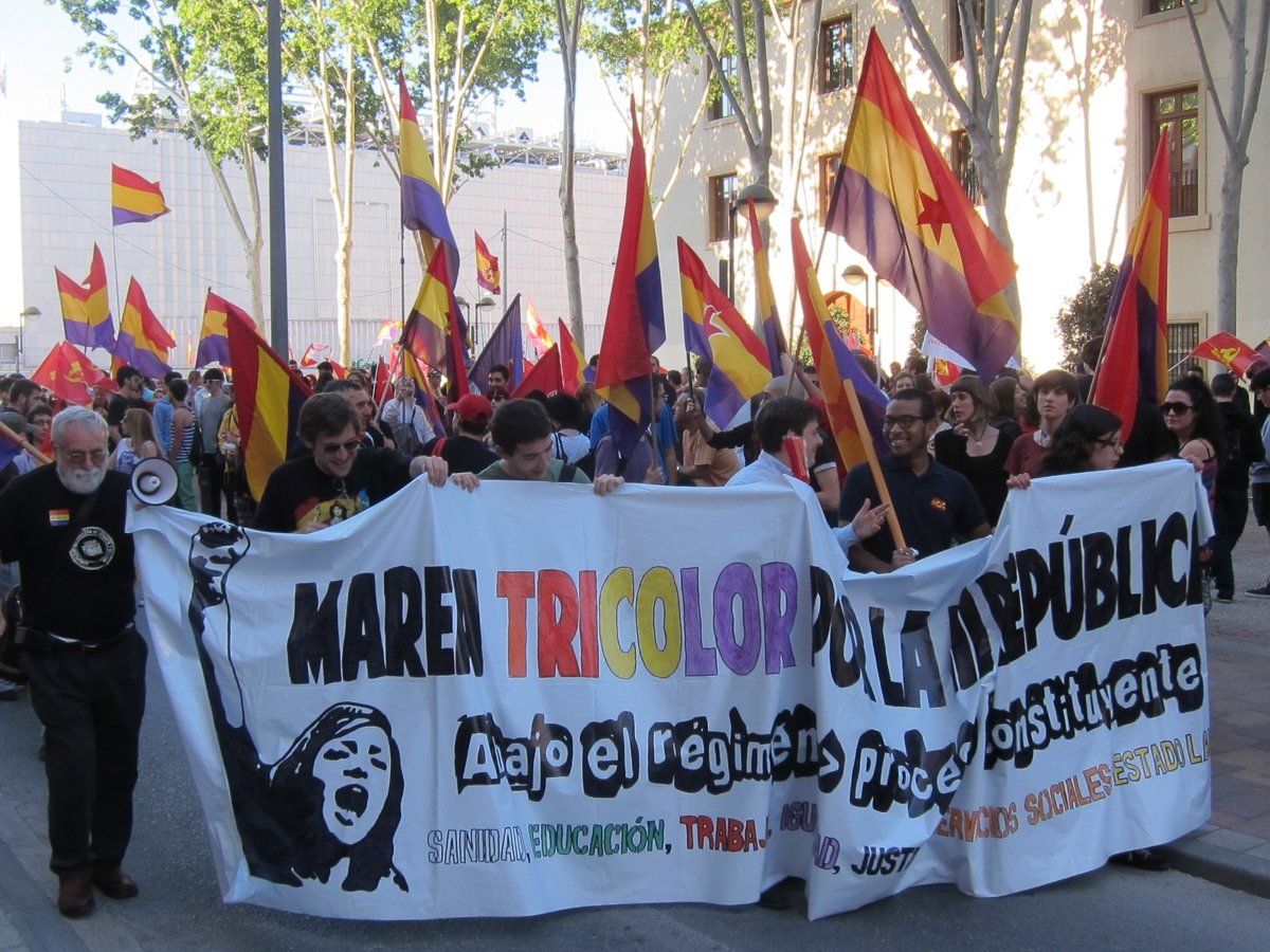 Unas 200 personas se han manifestado por las calles de Murcia para conmemorar el aniversario de la Segunda República y para pedir la instauración de la Tercera, secundando así la convocatoria de la plataforma 'Marea Tricolor'.