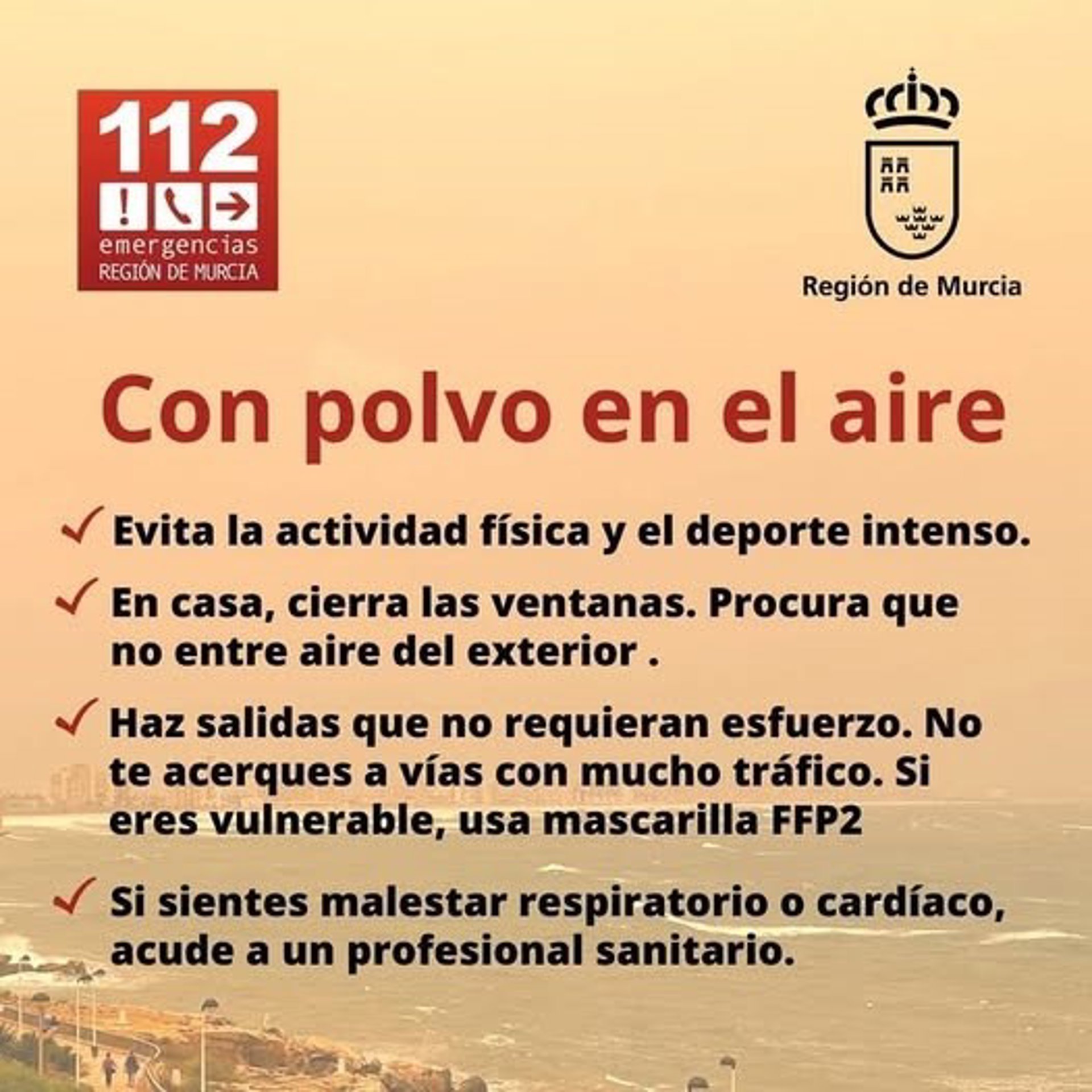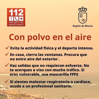 El '1-1-2' ha lanzado recomendaciones a la población ante la concentración de masas de aire africano prevista para este miércoles sobre la Región de Murcia, entre las que se encuentran evitar la actividad física y el deporte intenso y el cierre de ventanas en las viviendas.