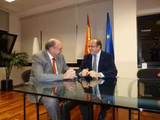 El director general de la Sociedad Estatal Aguas de las Cuencas Mediterráneas, Acuamed, Arcadio Mateo del Puerto, y el alcalde de Puerto Lumbreras, Pedro Antonio Sánchez, se han reunido este martes para planificar las actuaciones que se desarrollarán en el municipio con el fin de mejorar la seguridad en ramblas y cauces que sufrieron importantes daños tras la riada del pasado 28 de septiembre.