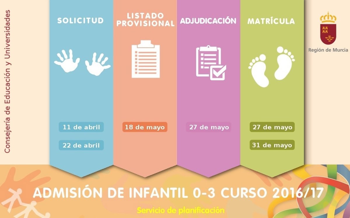 El día 11 de abril se abre el proceso de admisión para educación infantil de 0 a 3 años del curso 2016/2017 en los centros que imparten primer ciclo de Educación Infantil, dependientes de la Comunidad Autónoma y en las escuelas municipales creadas en el marco del Plan Educa3.