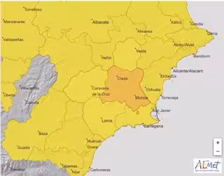 En su último boletín la Agencia Estatal de Meteorología sube a nivel naranja el aviso para la Vega del Segura, donde pueden darse acumulaciones de lluvia de 30 litros en una hora en zonas puntuales, desde las 16.00 hasta las 21.59 horas.