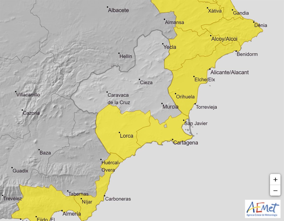 Imagen de las zonas que estarán con aviso amarillo - AEMET