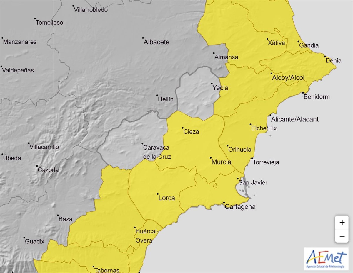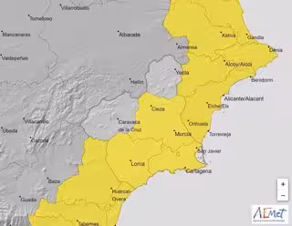 La Agencia Estatal de Meteorología (AEMET) ha ampliado la alerta amarilla por lluvias y tormentas para este viernes, 27 de noviembre, en los municipios de la Vega del Segura, el Valle del Guadalentín, Lorca y Águilas, y el Campo de Cartagena y Mazarrón.