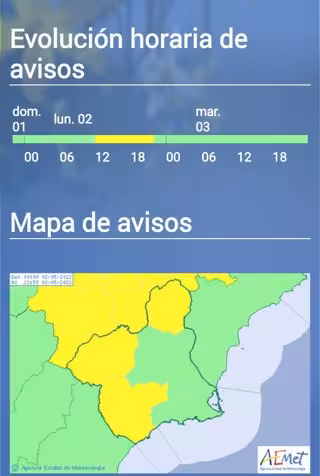 La Agencia Estatal de Meteorología (Aemet) ha ampliado el aviso de fenómeno adverso de nivel amarillo por tormentas para este lunes en la Región de Murcia.