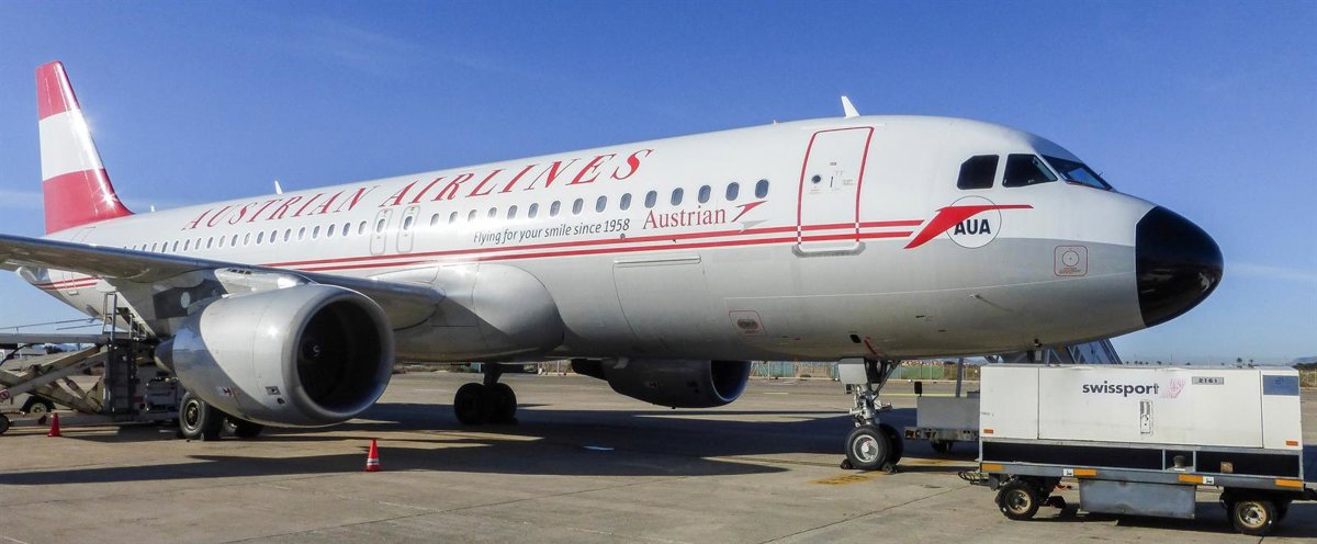 La versión actual del fuselaje de las aeronaves de Austrian es blanca, con la 'panza' del avión azul y el nuevo diseño corporativo de la flecha, más moderno y con la simulación de la sombra al fondo.