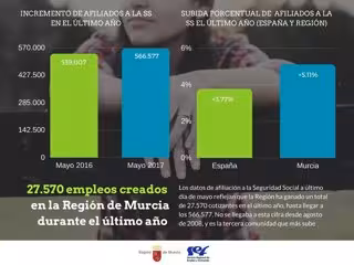 Los datos de afiliación a la Seguridad Social a último día de mayo, dados a conocer hoy por el Ministerio de Empleo, reflejan que la Región ha ganado un total de 27.570 cotizantes en el último año. Concretamente, la cifra de afiliados a la conclusión de mayo de 2016 era de 539.007, mientras que al cierre del pasado mes el número total asciende a 566.577.
