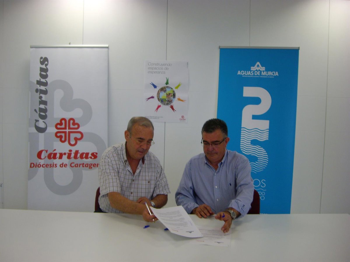 El director de Aguas de Murcia, José Albaladejo y el director de Cáritas Diócesis de Cartagena, José Luis Leante, han firmado convenio de colaboración por el que la empresa municipal se compromete a ayudar a la manutención de 344 niños vecinos de Murcia y que se encuentran en situación de exclusión social.