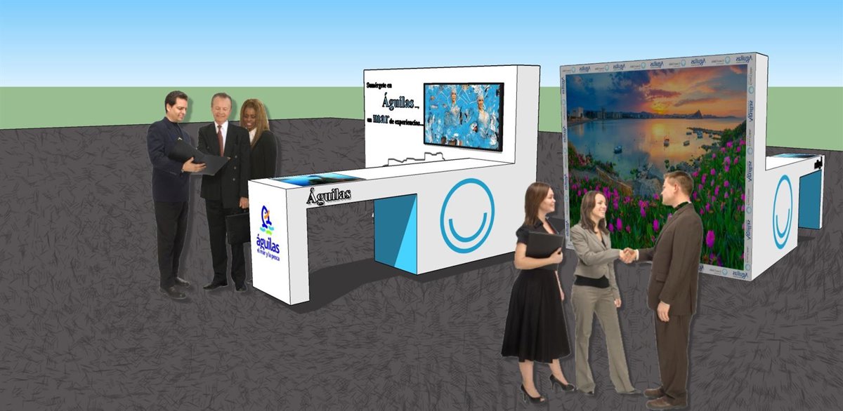 La zona expositiva estará dotada de un mostrador, con el slogan 'Sumérgete en Águilas, un mar de experiencias...', en el que se incluirá una fotografía retroiluminada de la costa aguileña, así como la silueta del Castillo San Juan de las Águilas, junto a un televisor de sesenta pulgadas en el que se difundirán vídeos de la ciudad y el carnaval. Una azafata atenderá al público en este lugar, ofreciendo numeroso material informativo y promocional sobre la oferta turística global de la localidad.