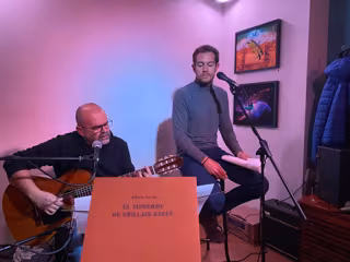 El poeta y el cantautor ofrecerán un recital-concierto en donde poemas y canciones dialogan "de igual a igual". En el repertorio, sonarán algunos de los versos del último poemario de Caride, ‘El síndrome de Guillain-Barré’, publicado por el sello editorial Colección Sudeste, pero también otros de sus anteriores libros y algunos inéditos.