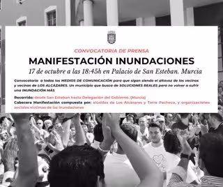 La manifestación saldrá del Palacio de San Esteban, sede del Gobierno regional, para desplazarse hasta la Delegación del Gobierno en Murcia, a las 18.45 horas, y la cabecera estará compuesta por los alcaldes de Los Alcázares, Mario Cervera y el de Torre Pacheco, Antonio León, así como organizaciones sociales víctimas de las inundaciones.