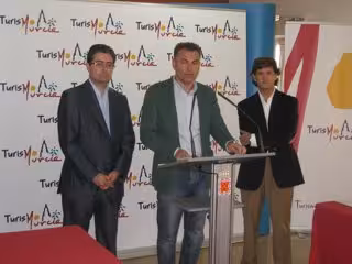El concejal de Turismo, Miguel Cascales; el Gerente de la Oficina de Congresos del Ayuntamiento de Murcia, Ramón Palazón, y el Presidente de los socios colaboradores de la Oficina de Congresos, Jesús Pacheco, han presentado esta mañana los datos de congresos y reuniones celebradas en Murcia durante el pasado año.