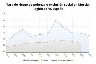 En cuanto a las tasas AROPE de riesgo de pobreza o exclusión social, las más elevadas se dieron en Extremadura (44,6%), Andalucía (38,2%) y Canarias (36,4%). En Murcia, el 32,7 por ciento de la población residente estaba en riesgo de pobreza o exclusión social en 2018, una variación de -2 puntos porcentuales comparado con el año anterior, según la Encuesta de Condiciones de Vida del Instituto Nacional de Estadística.