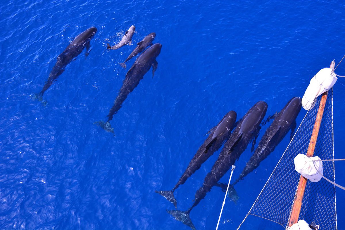 Durante los dos primeros días de navegación recorriendo la mayor parte de la costa sur de la Región de Murcia, entre Cartagena y Águilas, la tripulación a bordo del velero Else avistó ayer dos grupos de calderones formados por una docena y más de 70 individuos respectivamente, con presencia de numerosas crías recién nacidas en ambos casos, además de dos pequeños grupos de delfines listado y mular.