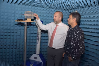 Fotografías de José Antonio López Pastor, junto a la antena radar wifi que ha desarrollado y con su director de tesis en la cámara anecoica de la Escuela de Telecomunicación. - UPCT