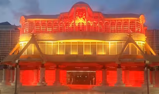 El edificio de la Asamblea Regional de Murcia se ha iluminado, por primera vez en la historia, con los colores de la bandera de España, para conmemorar el Día de la Hispanidad.