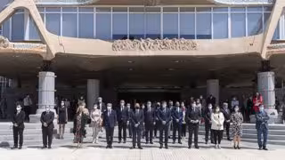 El presidente de la Asamblea Regional, Alberto Castillo, representantes del Gobierno regional, diputados de los cinco grupos y trabajadores del Parlamento autonómico se han sumado al minuto de silencio, en memoria de las víctimas del COVID-19, que ha tenido lugar a las 12.00 horas en los soportales de la Asamblea.