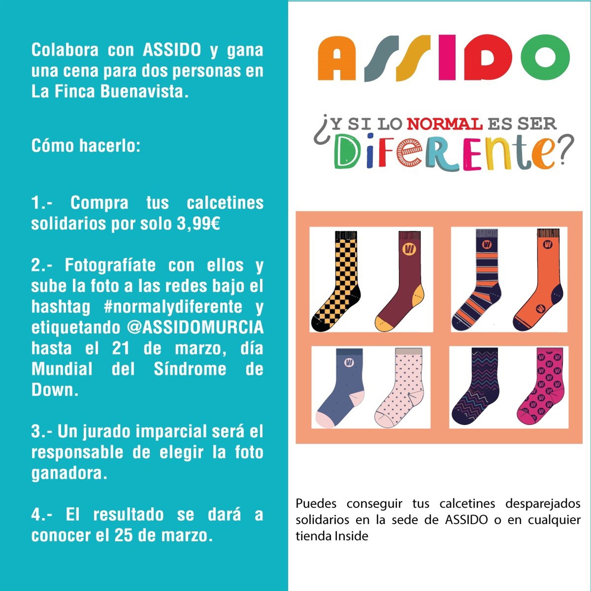 Así, la asociación ha sacado cuatro modelos de calcetines desparejados con tallas de adultos y niños y propone un reto: hacerse una foto con alguno de ellos y subirla a redes sociales antes del 21 de marzo con el hashtag #NormalyDiferente, etiquetando a @ASSIDOMURCIA. La imagen más original ganará una cena para dos personas en la Cabaña Buenavista, de Pablo González-Conejero.