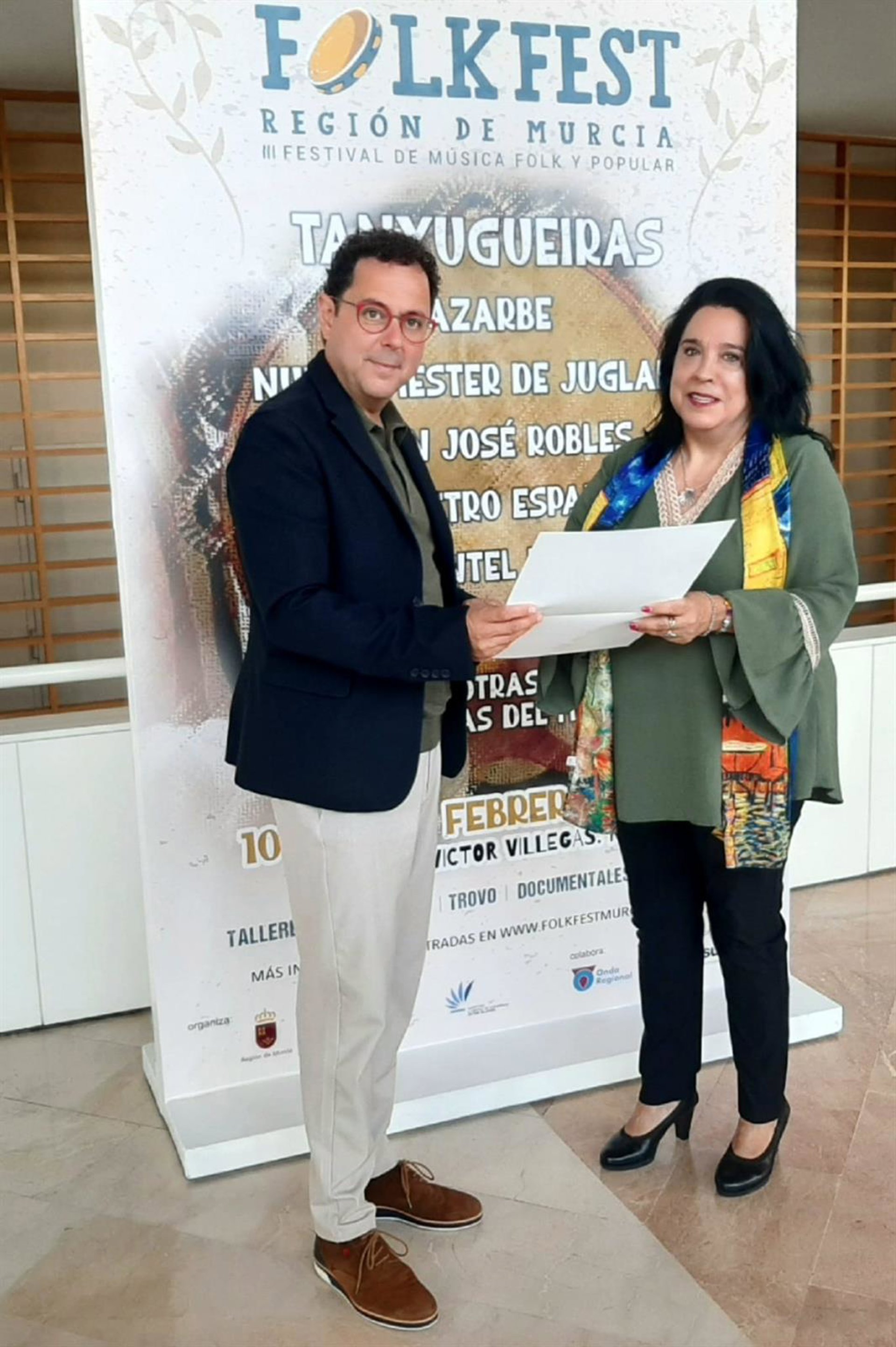 El director general del ICA, Manuel Cebrián, y la directora de Folkfest, Alicia Baltasar, frente al cartel de la nueva edición del festival - CARM