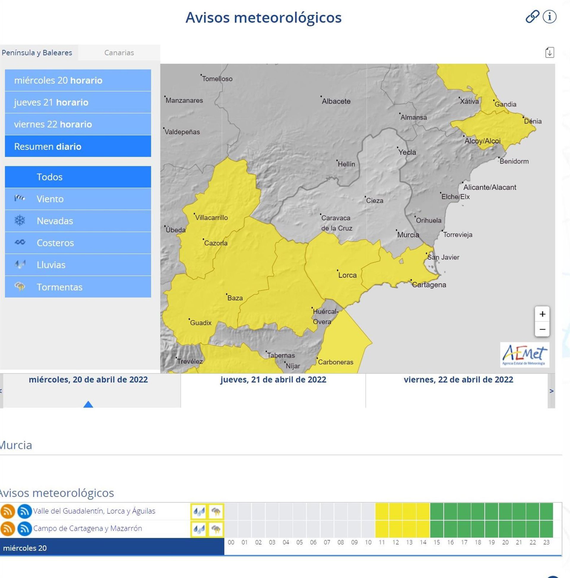 La Agencia Estatal de Meteorología (Aemet) ha publicado un aviso de nivel amarillo por lluvias y tormentas hasta las 15.00 horas de este miércoles en el Valle del Guadalentín, Lorca, Águilas, el Campo de Cartagena y Mazarrón.