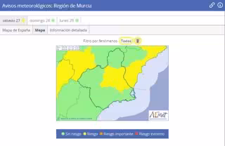 En concreto, la alerta estará activa desde las 12.00 horas a las 18.00 horas de este sábado en la Vega del Segura con una probabilidad de entre el 40 y el 70 por ciento, según fuentes de la Aemet consultadas por Europa Press.