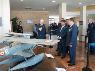 El alcalde de Los Alcázares, Anastasio Bastida y el general jefe del Servicio Histórico y Cultural del Ejercito del Aire, Jose Javier Muñoz Castresana han presentado este jueves la exposición 'Historia del Ejercito del Aire', que con motivo del Centenario de la Hidroaviación Militar Española que se celebra en Los Alcázares, ha sido trasladada desde Museo del Ejercito del Aire en Madrid a Los Alcázares.