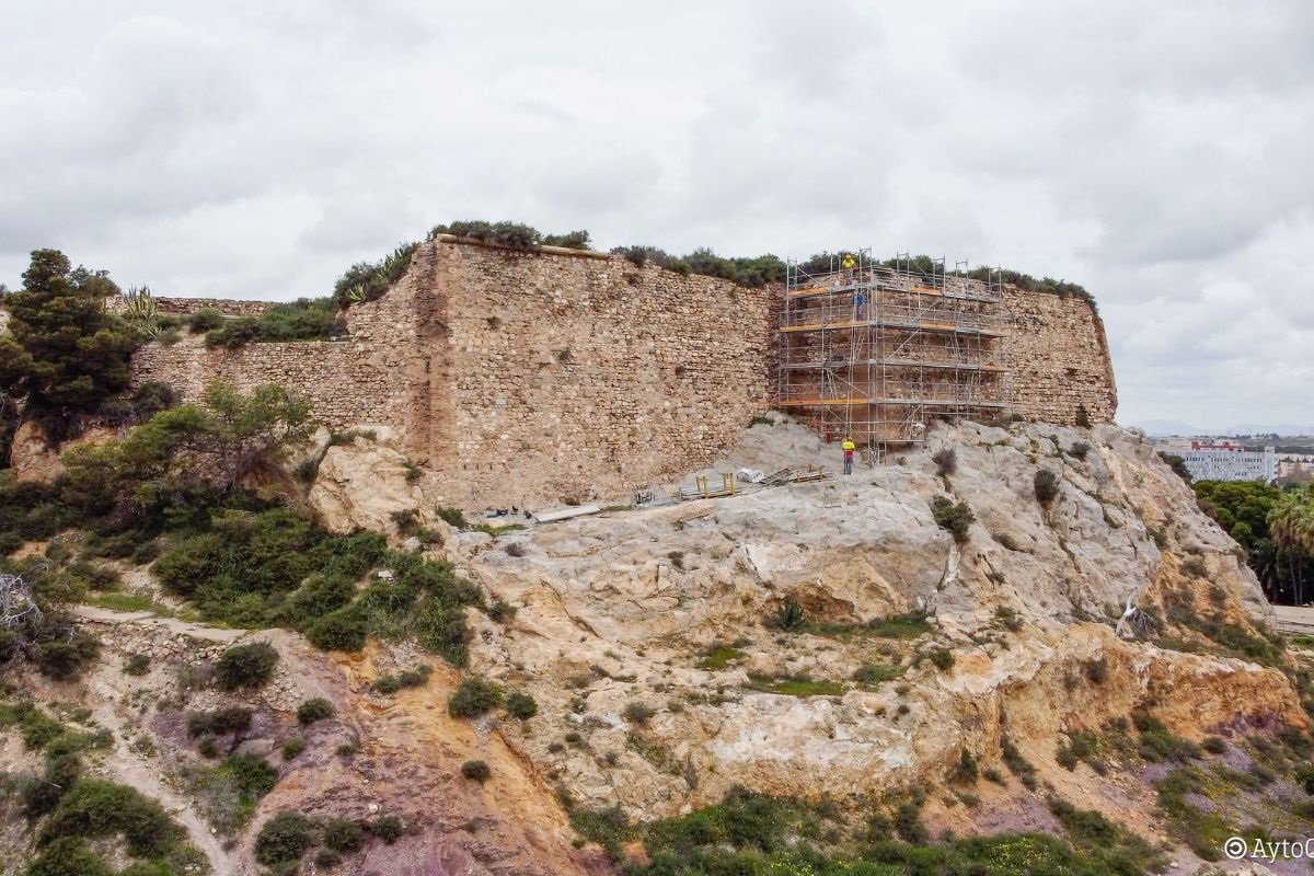 Para realizar las tareas de conservación se está instalando un andamio de grandes dimensiones. Estas obras son un paso más en la ejecución del Plan Director que redactó Huma Arquitectos para el Ayuntamiento, y que permitirá la recuperación integral del fuerte. Esta nueva fase contempla restaurar los muros de la zona sur, conservados frente a la fachada lateral del antiguo Cuartel de Antiguones, actual campus de la UPCT. Están parcialmente derrumbados por el paso del tiempo y por la erosión.