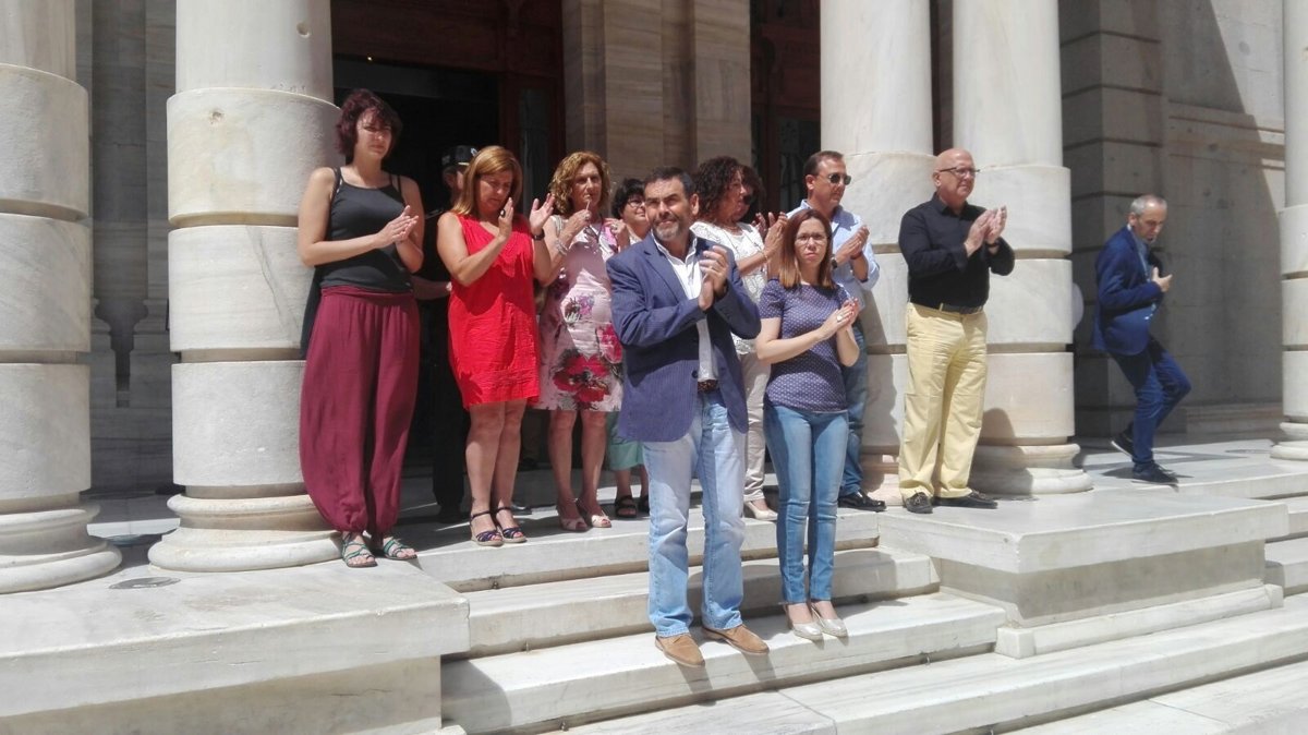 Las escaleras del Palacio Consistorial de Cartagena han sido escenario este miércoles del minuto de silencio al que se ha sumado el Ayuntamiento de Cartagena como señal de condena hacia el atentado que, en la noche de este martes, 28 de junio, costaron la vida a alrededor de cuarenta personas en el aeropuerto de Estambul, en Turquía, y que ha dejado más de un centenar de heridos.