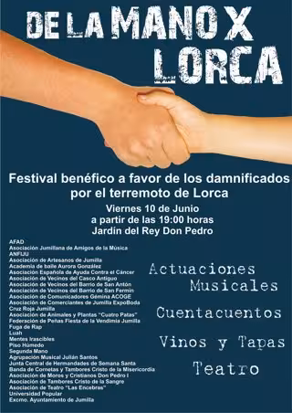 El Ayuntamiento de Jumilla ha organizado, a través de varios colectivos y atendiendo la llamada de la Asociación de Tambores, una jornada bajo el lema 'De la mano por Lorca' en la que se desarrollarán varias actividades con el único fin de recaudar dinero que será canalizado a través de Cruz Roja Jumilla con destino a la Ciudad del Sol y los damnificados por el terremoto.
