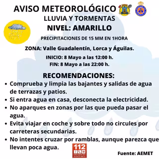 El concejal de Emergencias del Ayuntamiento de Lorca, José Martínez, ha anunciado que la Agencia Estatal de Meteorología (AEMET) ha pedido a los vecinos que, ante el aviso amarillo por lluvia y tormentas en el Noroeste que comienza esta tarde "que sigan las indicaciones tanto del Servicio Municipal de Emergencias como del Ayuntamiento de Lorca a través de la web www.lorca.es y las redes sociales Facebook, Instagram y Twitter".