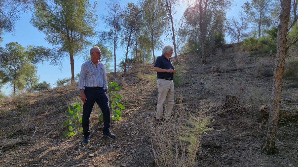 El concejal de Planificación Urbanística, Huerta y Medio Ambiente, Antonio Navarro, y el presidente de la Junta Municipal de El Esparragal, Ángel Pérez, han visitado las labores de silvicultura que se realizan en el parque municipal de Montepinar, en El Esparragal.