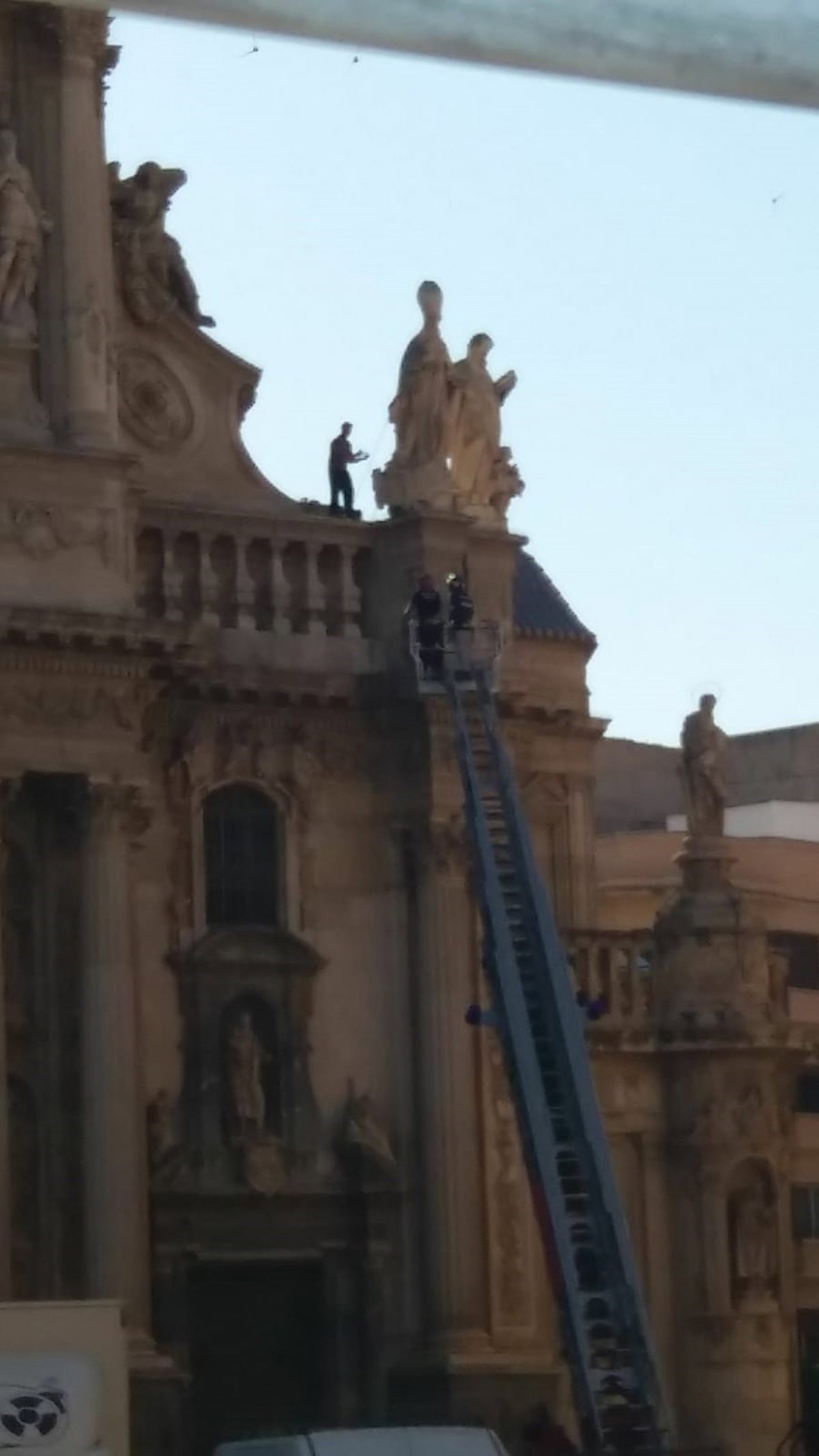 El suceso ha tenido lugar a primera hora de la mañana, cuando el individuo se ha encaramado a la fachada de la Catedral y ha amenazado con tirarse a la plaza del Cardenal Belluga porque, supuestamente, le habían estafado.