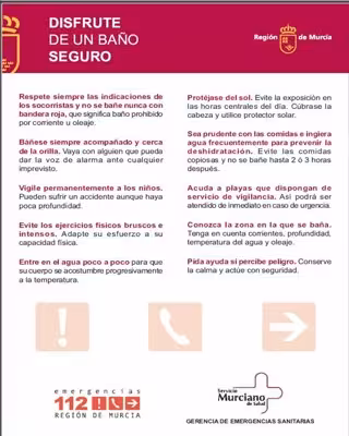 En Águilas, hay bandera amarilla en las playas de Matalentisco, Calarreona, La Higuerica y La Carolina; en Lorca, en Puntas de Calnegre; en Mazarrón, en la playa de La Pava; en Cartagena, en las playas del Galúa, Las Sirenas, Entremares, Zeus y Calblanque. En estos dos últimos casos hay tramos señalizados con bandera roja.