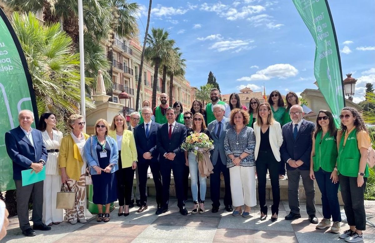 Al acto de izada, enmarcado en el día de la tradicional cuestación de la asociación, han asistido, entre otros, el presidente de la AECC en la Región, Manuel Molina; la delegada del Gobierno, Caridad Rives; los consejeros de Salud y Política Social, Juan José Pedreño y Conchita Ruiz, respectivamente, y el alcalde de Murcia, José Antonio Serrano.