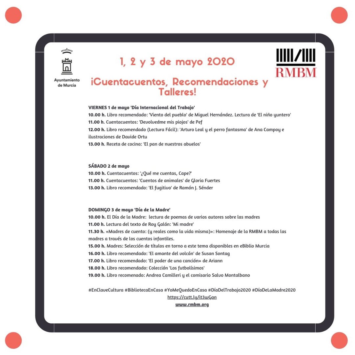 La Red Municipal de Bibliotecas de Murcia (RMBM), dependiente de la Concejalía de Agenda Urbana y Gobierno Abierto, que dirige Mercedes Bernabé, ofrece un programa variado para disfrutar de la lectura durante este puente de mayo, según informaron fuentes municipales en un comunicado.
