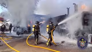 Para extinguir el incendio fueron necesarios 26 metros cúbicos de agua, más agente espumógeno por la rotura de un tanque de aceite y otro de gasoil que a su vez propagaron el fuego a otra decena de coches.