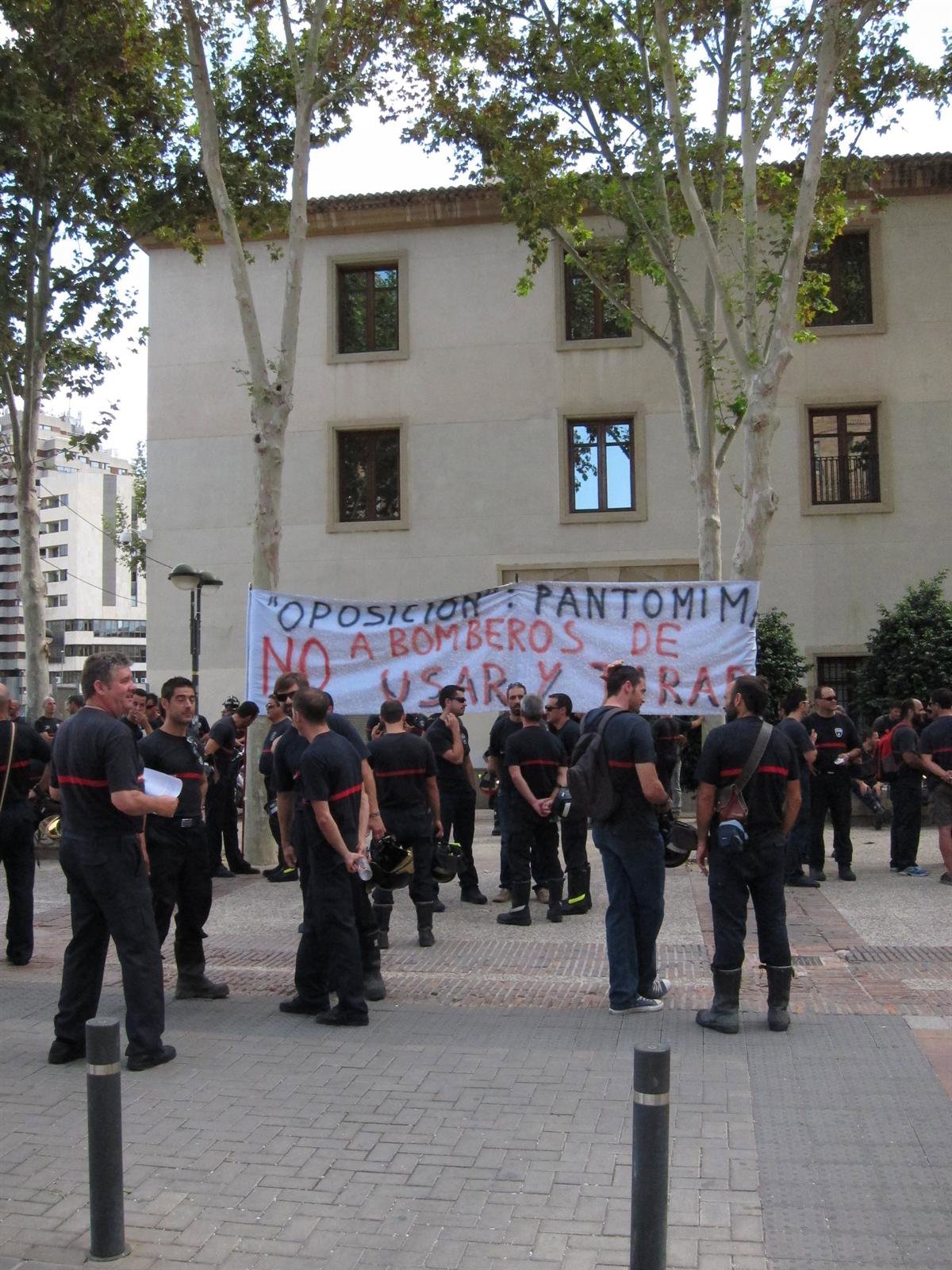 Cerca de medio centenar de bomberos se han concentrado ante San Esteban con una pancarta en la que se podía leer 'Oposición: pantomima. No a bomberos de usar y tirar'. En concreto, han acudido a acompañar a los delegados de personal que han ido, en representación de la plantilla, a presentar unas firmas de petición al consejero de Presidencia, Manuel Campos, para pedirle "una solución".