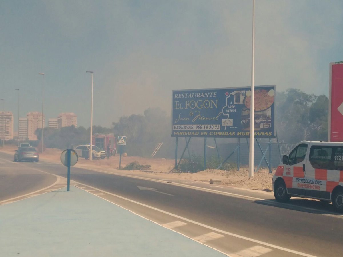 El Centro de Coordinación de Emergencias 1-1-2 Región de Murcia ha recibido diversas llamandas a partir de las 12.09 horas indicando el incendio de matorral junto al puente del Estacio y la carretera en La Manga del Mar Menor, en el término municipal de San Javier.