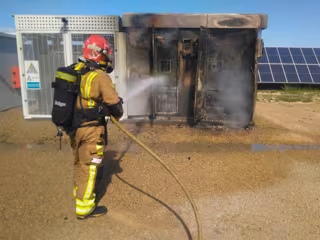 Un bombero apaga el fuego originado en una planta fotovoltaica en Totana (Murcia) - CEIS