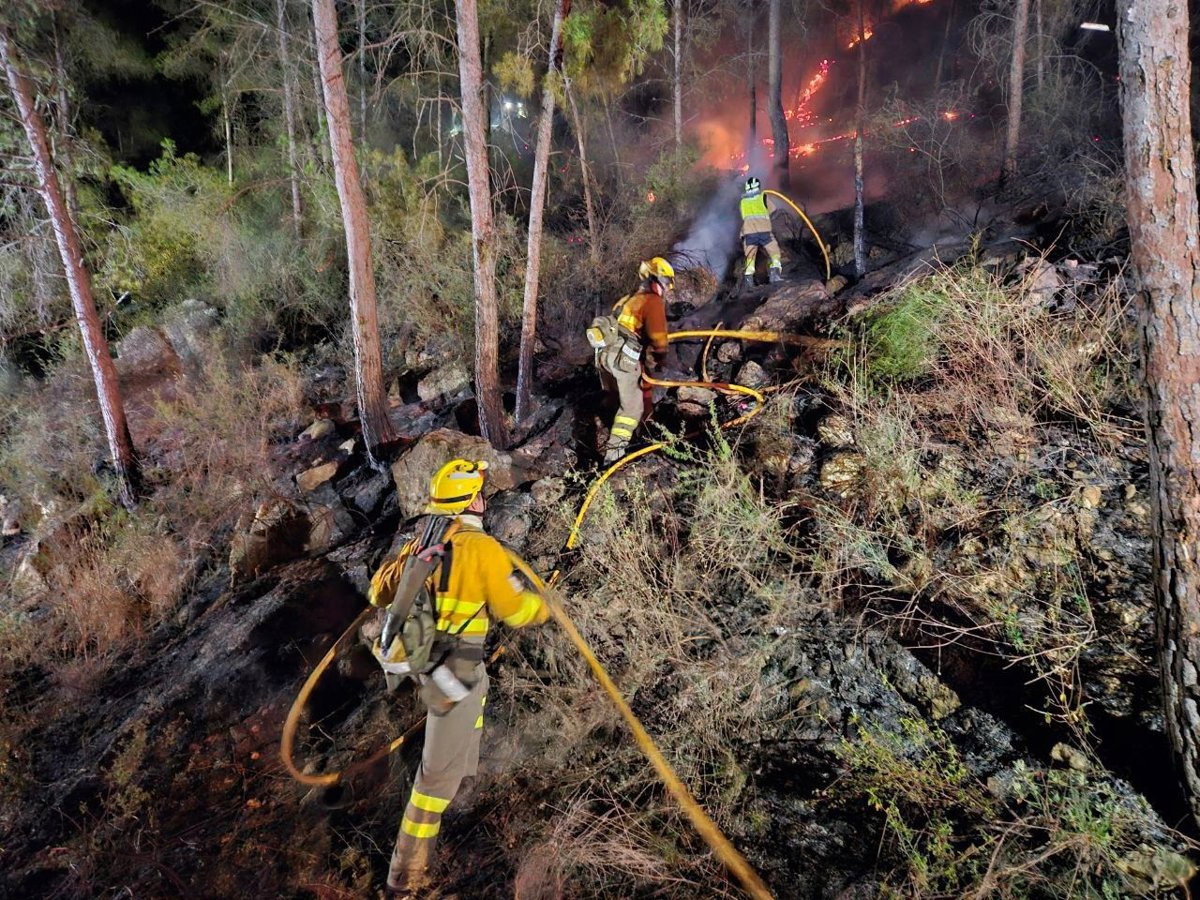 En el lugar trabajan Bomberos del SEIS del Ayuntamiento de Murcia, agentes medioambientales, tres brigadas forestales, un brigada de intervención rápida, la Unidad de Análisis y Planificación de Incendios Forestales de la Dirección General del Patrimonio Natural y Acción Climática Miembros de Protección Civil del Ayuntamiento de Murcia, en tareas de apoyo logístico.