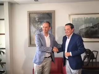 Javier Celdrán y José María Albarracín se saludan momentos antes de comenzar su reunión - EUROPA PRESS